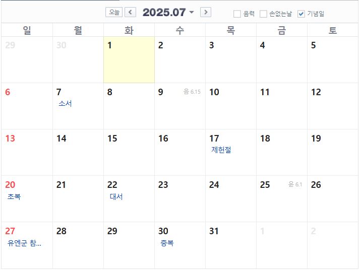 2025년 7월 공휴일
