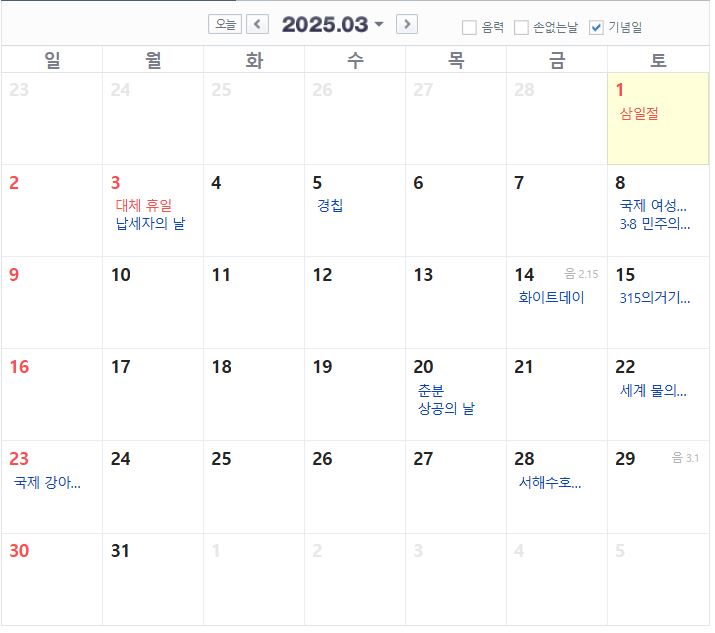 2025년 3월 공휴일