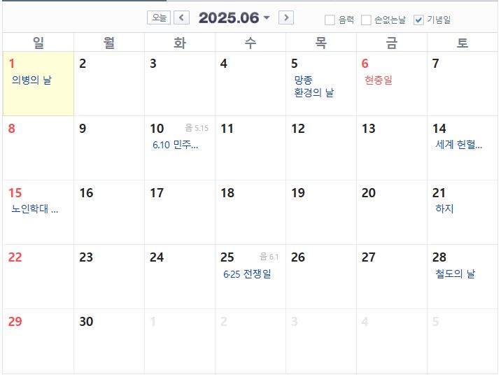 2025년 6월 공휴일