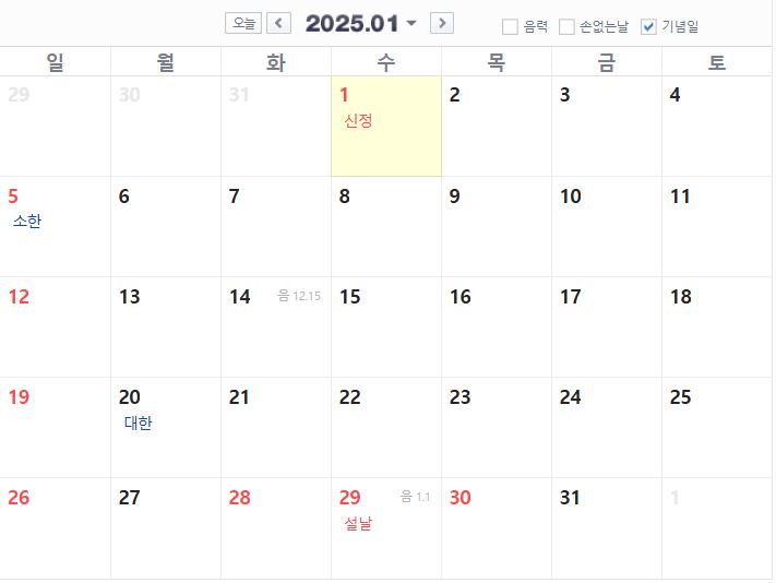 2025년 1월 공휴일