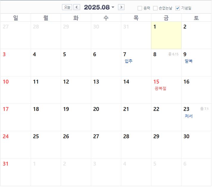 2025년 8월 공휴일