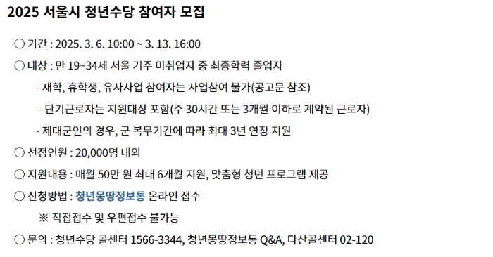 이번 포스팅에서는 2025 서울시 청년수당의 달라진 점과 신청 자격, 지원 내용, 주의사항, 신청 방법까지 꼼꼼하게 정리해드리겠습니다. 서울에 거주하는 청년이라면 꼭 확인하시고, 놓치지 말고 신청해보세요!