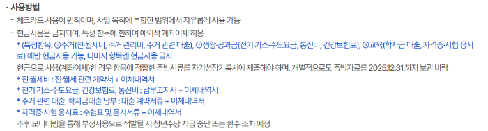 단, 주거비(전·월세), 공과금, 교육비 등 필수 생활비는 예외적으로 현금 사용이 허용됩니다.