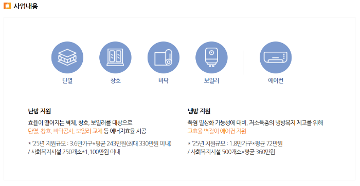 올해는 총 1,076억 원의 예산을 투입하여 난방 지원 3만 6,000가구 및 250개 시설, 냉방 지원 1만 8,000가구 및 500개 시설을 목표로 운영됩니다.