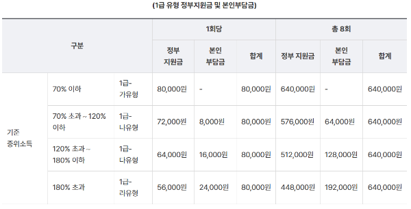 2️⃣ 지원금 : 정부에서 제공하는 지원금은 개인의 소득 수준에 따라 다르며, 1급과 2급으로 나뉘어 지원됩니다. 1급의 경우 최대 80,000원이 지원되며, 2급은 최대 70,000원이 지원됩니다.