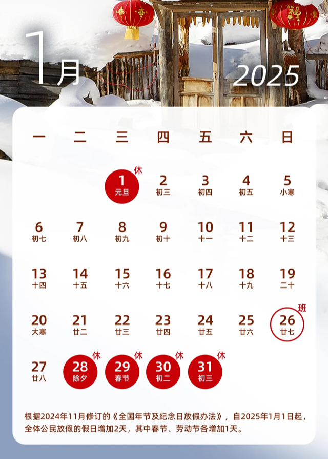 - 춘절: 2025년 1월 28일(화) - 2월 4일(화) / 8일 휴무