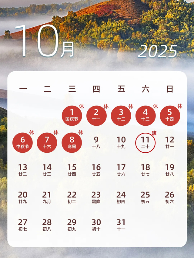- 중추절, 국경절: 2025년 10월 1일(수) - 10월 8일(수) / 8일 휴무