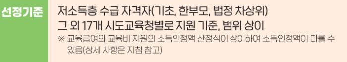 ✔️ 가구의 소득인정액이 지원기준에 해당하는 학생 (단, 시·도교육청에 따라 다름)