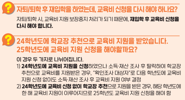 ✅ 자동 연장 여부 확인 : 기존에 교육비 지원을 받고 있었다면 매년 소득 조사 후 자격이 유지되면 별도의 신청 없이 연장됩니다.