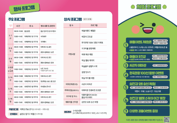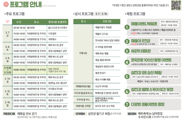 2. 체험행사: 지구마불 광양여행, 매화마을 인생네컷 포토존 운영, 매화 목공 체험, 매실 하이볼 체험, 매실 힐링 테라피, 매화랑 2박 3일, 매화길 만보 걷기, 매화마을에서 보내는 봄날 러브레터