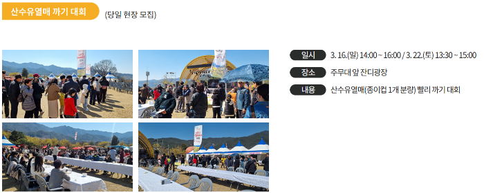 | 경연 | 산수유 사진 공모전, 시 공모전, 그림 그리기 대회 |