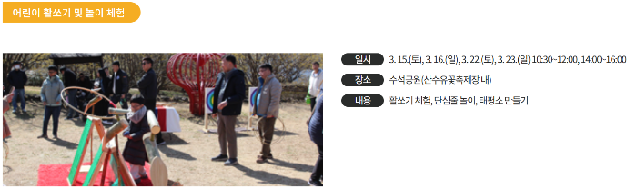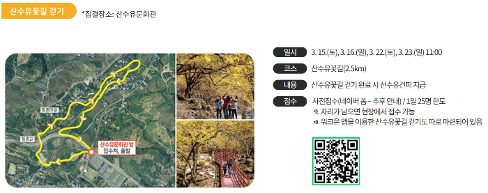 | 기타 | 산수유꽃길 걷기, 사진 포토존 운영, 야간 경관조명 설치 |
