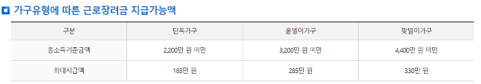 일을 하고 있음에도 불구하고 생활이 어려운 가구를 지원하기 위해 만들어진 제도로, 신청 후 심사를 거쳐 가구 유형, 연 소득, 재산 기준 등을 종합적으로 판단하여 지급됩니다.