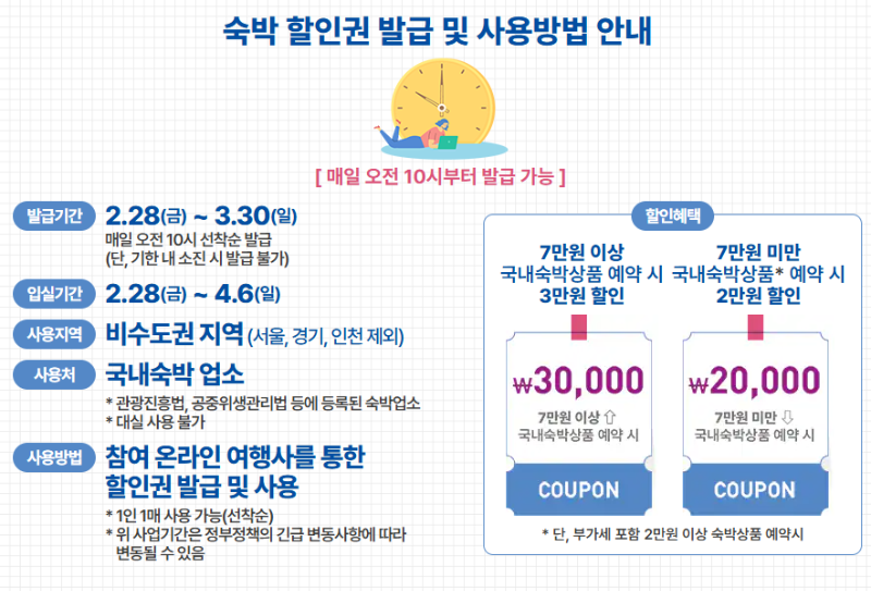 숙박 할인쿠폰은 국내 대표 온라인 여행사(OTA)를 통해 매일 오전 10시 선착순으로 발급됩니다. 1인당 1매씩 받을 수 있으며, 조기 소진될 수 있으므로 빠르게 예약하는 것이 중요합니다.