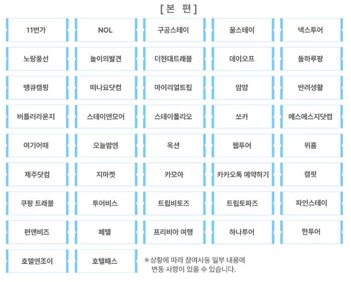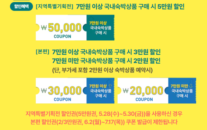 | 지역특별기획편 | 5/28(화) ~ 5/30(목) | 6/5(수) ~ 7/17(목) | 7만 원 이상 숙박 시 5만 원 할인 |
