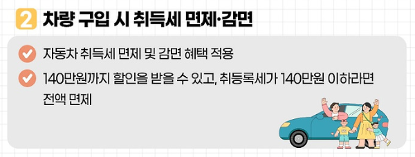 18세 미만 자녀가 두 명 이상인 경우, 승용차(7~10인승) 구매 시 취득세의 50%를 감면받을 수 있습니다. 승합차 및 화물차도 동일하게 취득세 감면 혜택을 받을 수 있습니다.