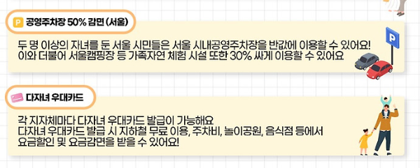 두 자녀 이상의 가정을 위한 주차비 할인 혜택이 마련되어 있습니다. 서울시를 비롯한 여러 지방자치단체에서 공영주차장과 한강공원 주차장의 요금을 50% 감면해 주고 있습니다. 서울시의 경우 ‘바로녹색결제’ 시스템에 차량을 등록하면 자동으로 할인 혜택을 받을 수 있습니다.