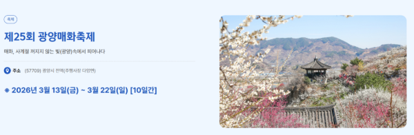 봄 여행을 가장 먼저 시작하고 싶다면 2026년 봄꽃축제 중 광양 매화 축제를 가장 먼저 추천합니다.